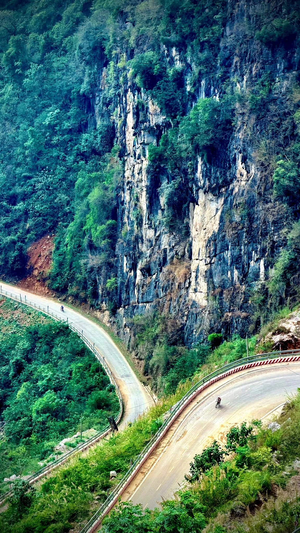 From the summit the road simply disappears, dropping away in 14 arse-cheek tight switchbacks that look less like a road and more like a series of goat tracks etched into the mountainside. Looking down from above, with the karst peaks stacked all around us, it doesn't quite look real.